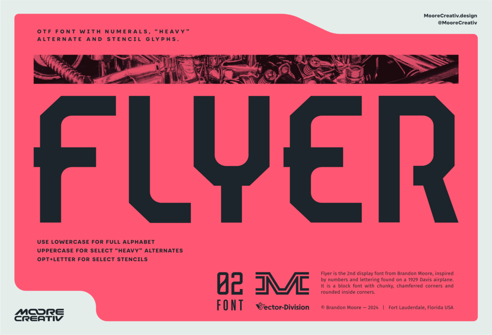 Flyer is a display font from Brandon Moore, inspired by numbers and lettering on a 1929 Davis airplane. A block font with chunky, chamfered corners and rounded inside corners.
